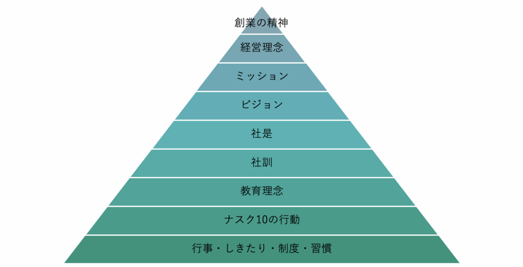 経営理念体系とは、以下のピラミッドに表されるように、上部は「上位概念」といわれる最も大切な価値観で、下部は「下位概念」とされています。下部にある考え方は重要ではない、ということではなく、ナスクの大切な価値観を多角的に表したものがこの経営理念体系です。